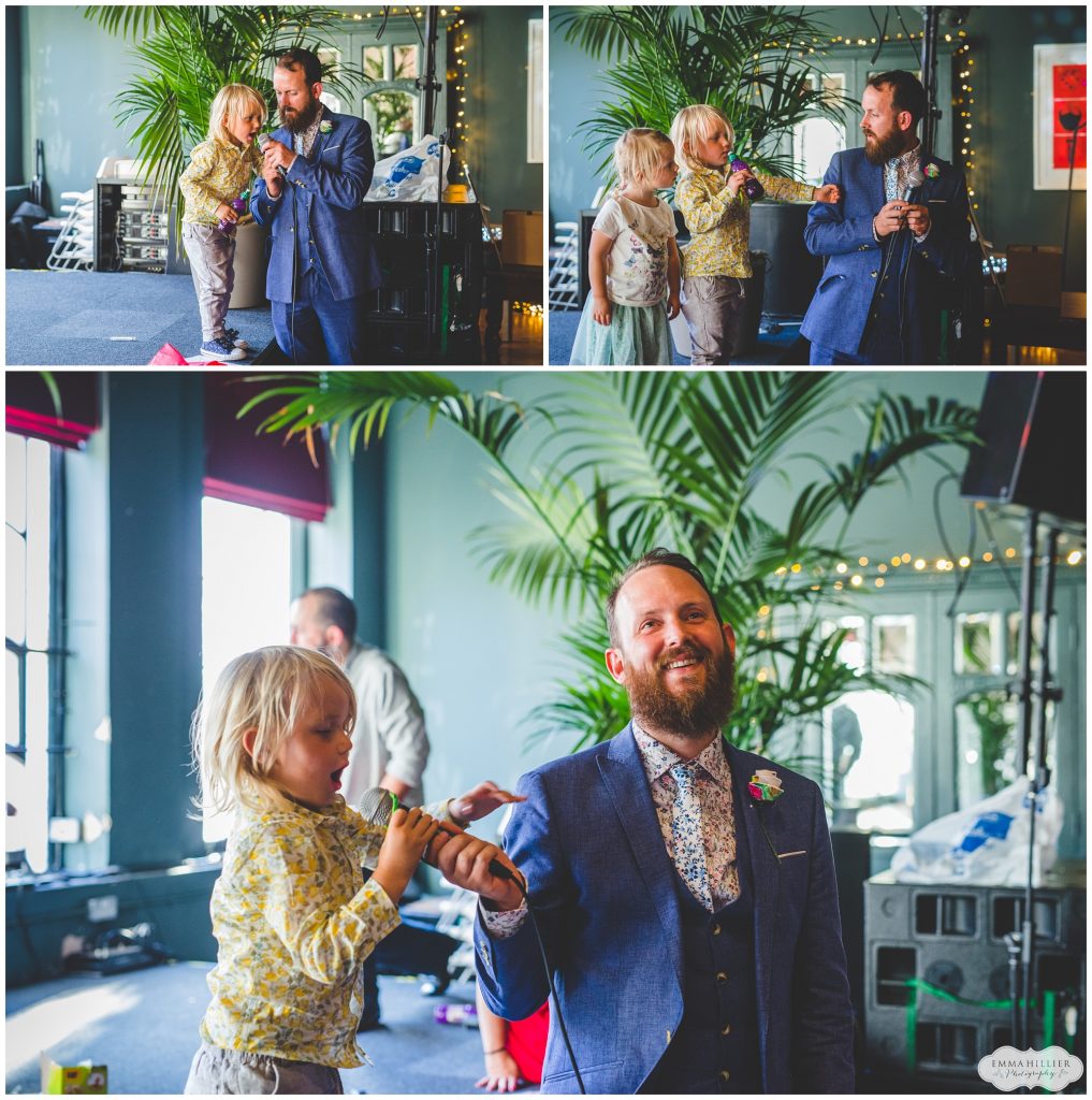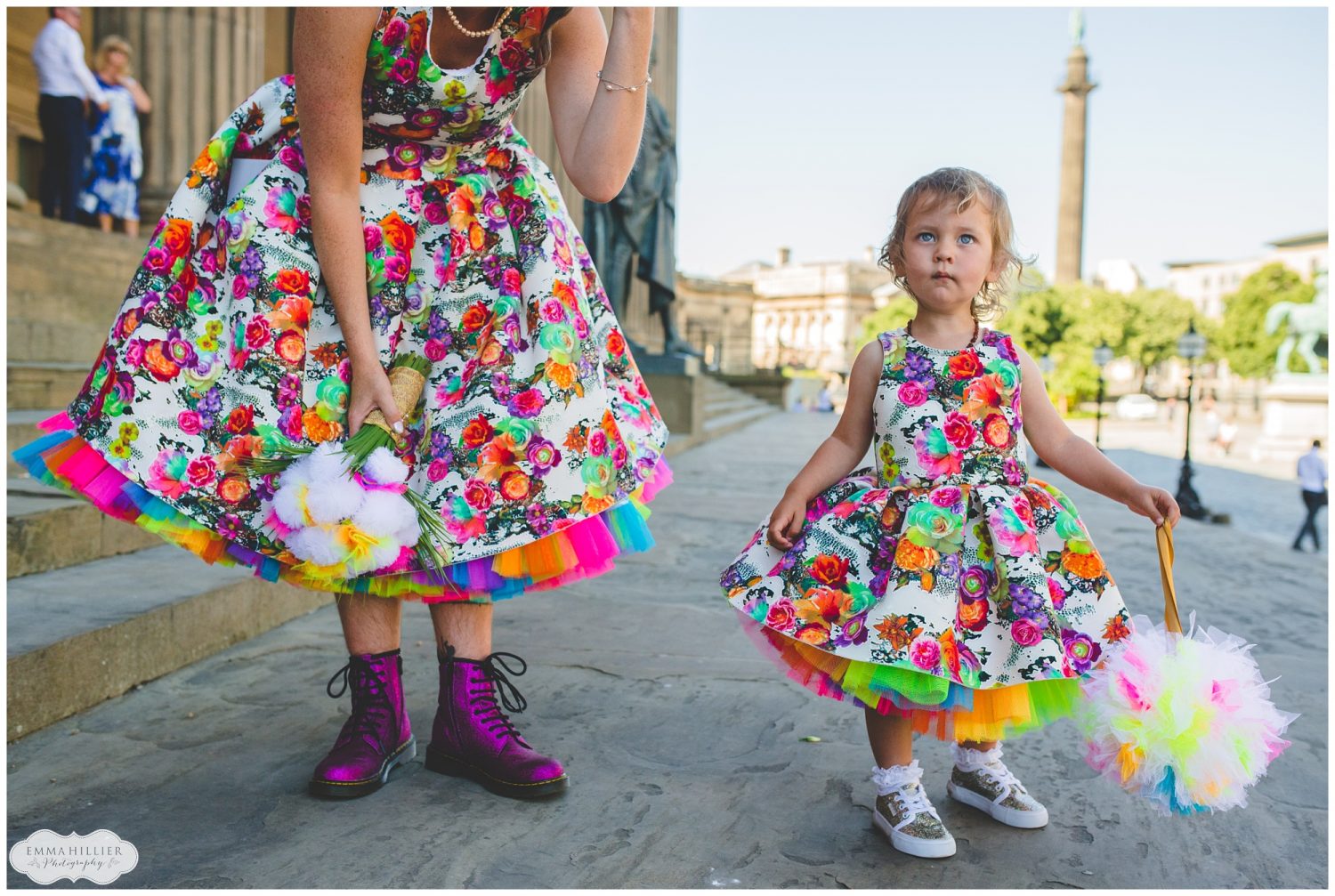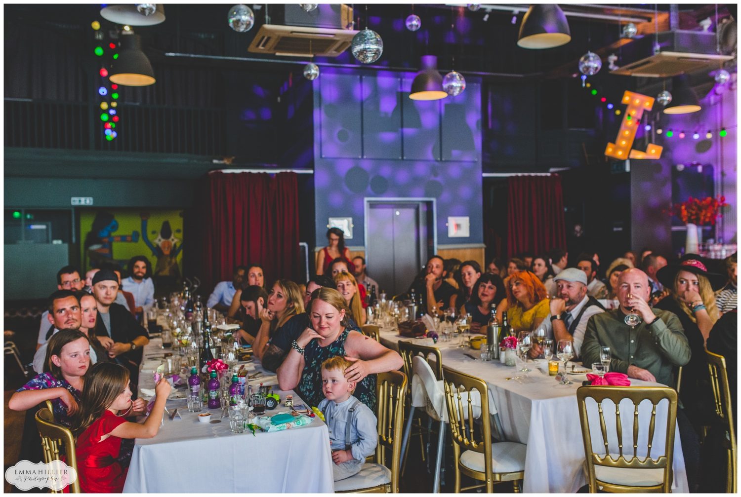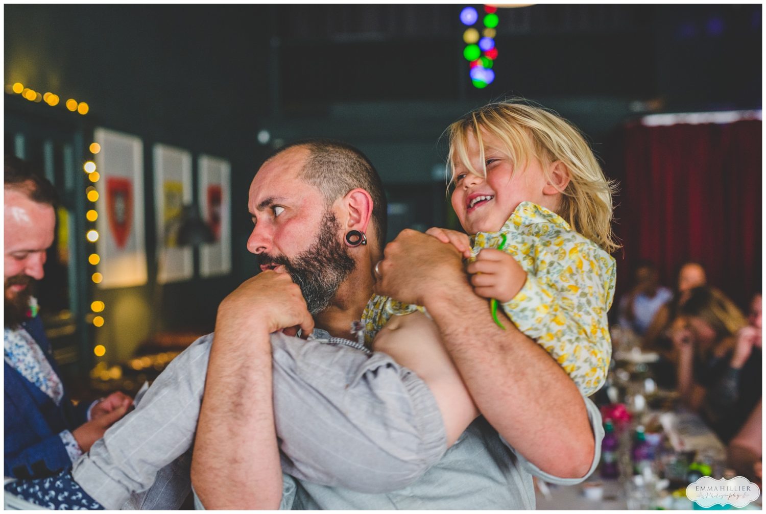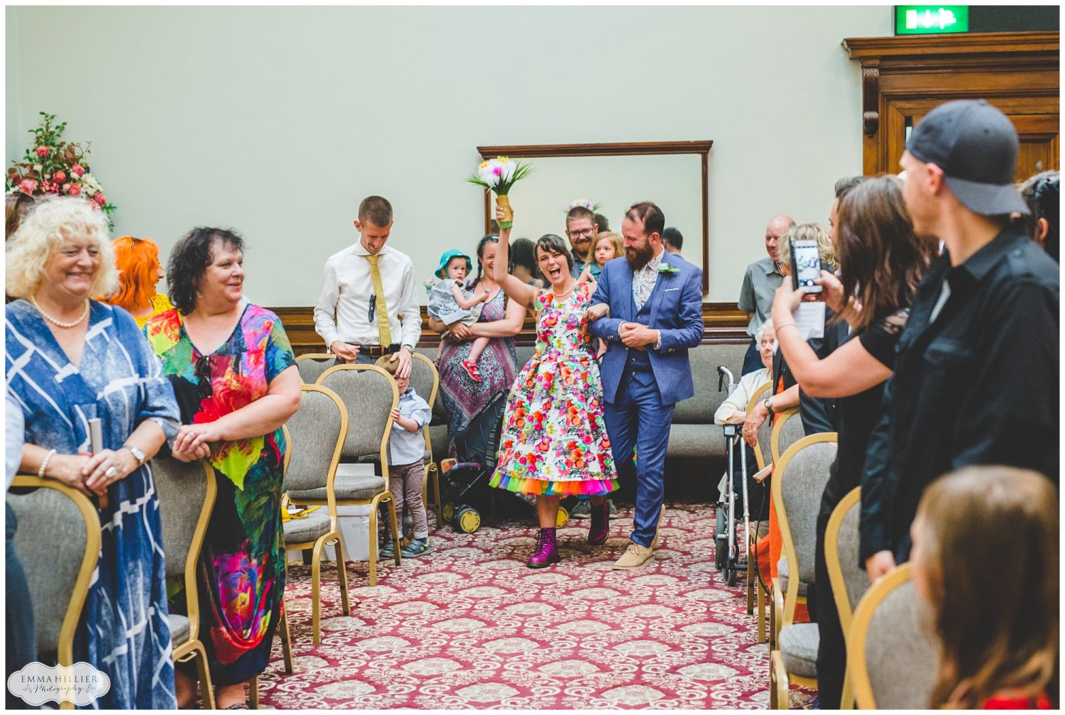 Rachel made her amazingly colourful dress herself (with a matching one for their little daughter!) which she matched with bright pink Dr. Martens and they walked down the “aisle” at St George’s Hall together. They didn’t have bridesmaids or groomsmen but they did let their children Magnus and Marla take part in the speeches which ended in Magnus hogging the mike and causing mass hysterics!