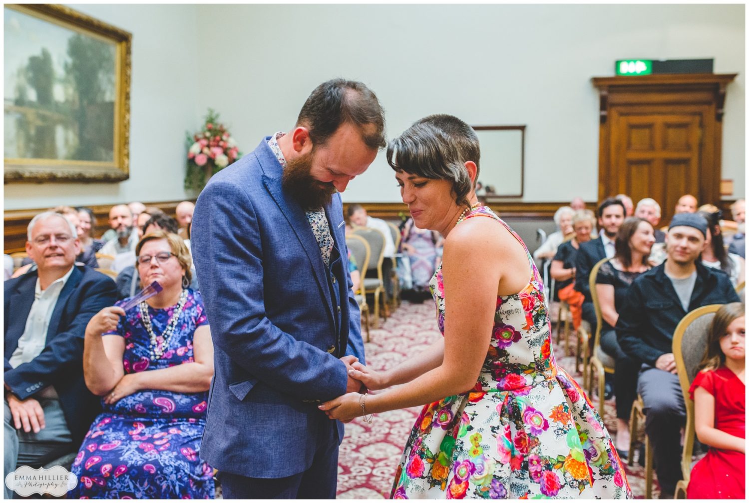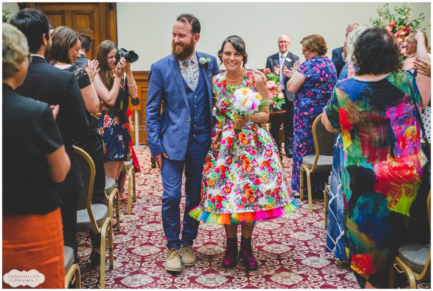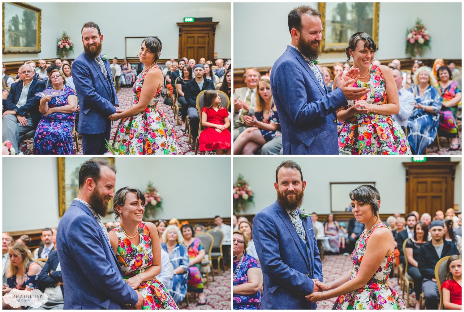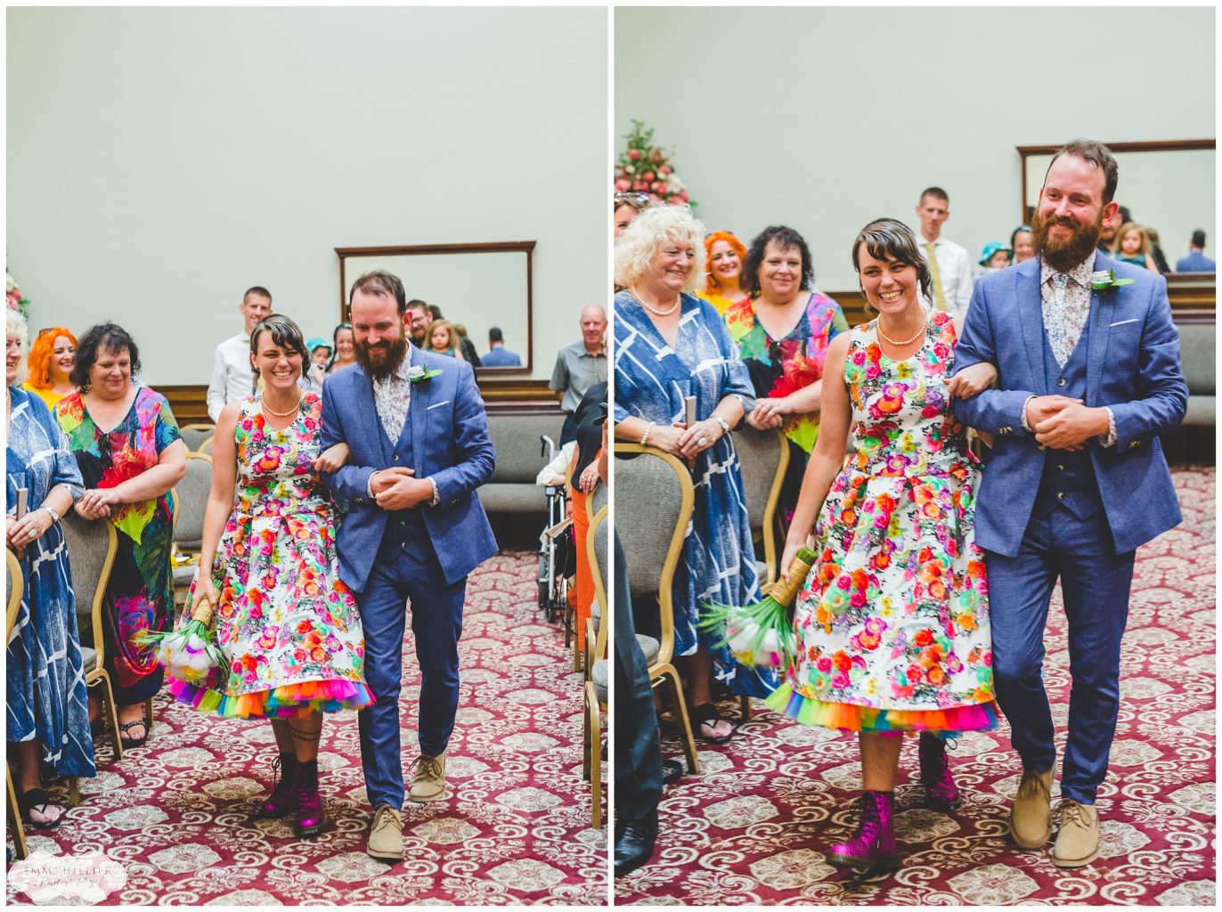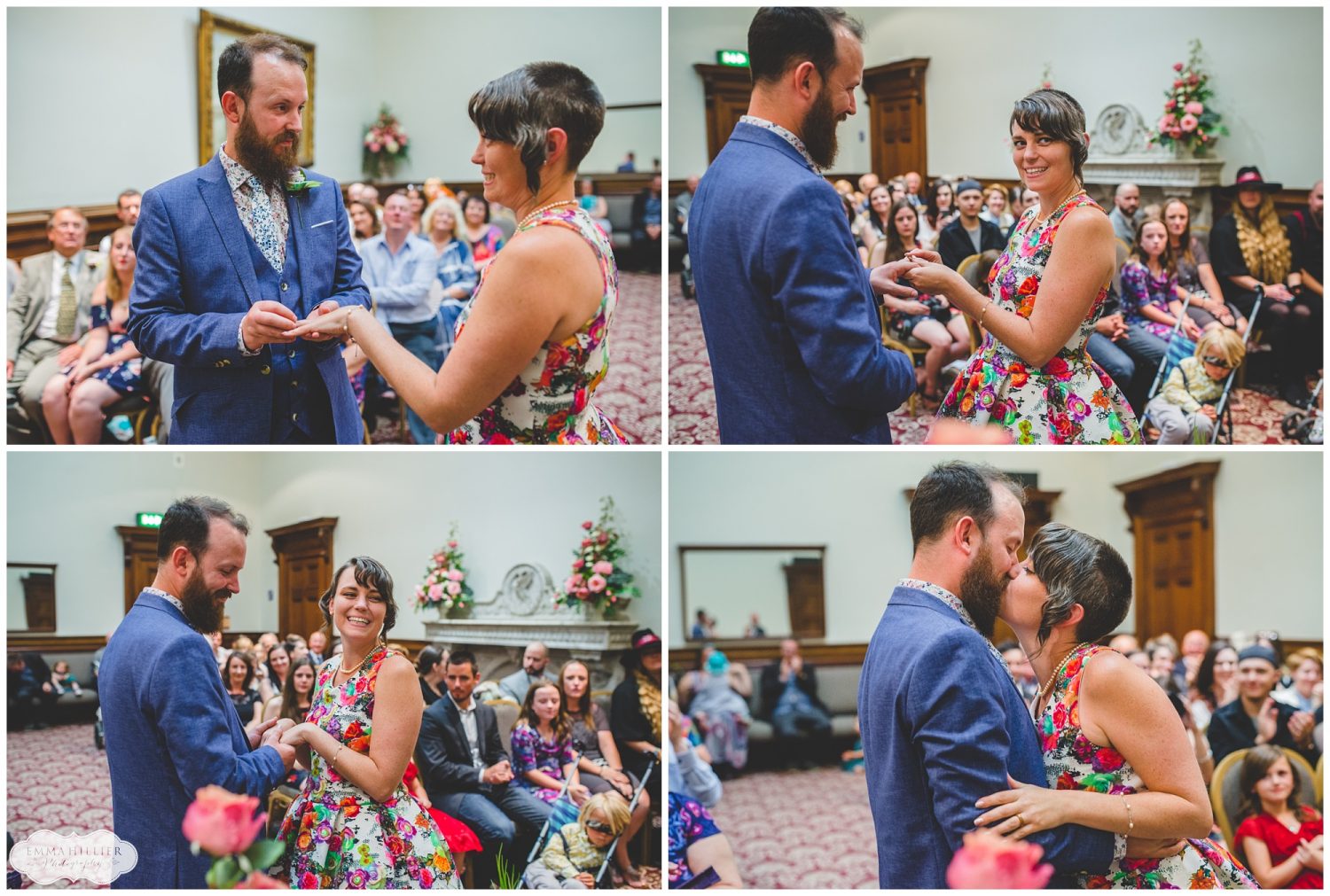 Rachel made her amazingly colourful dress herself (with a matching one for their little daughter!) which she matched with bright pink Dr. Martens and they walked down the “aisle” at St George’s Hall together. They didn’t have bridesmaids or groomsmen but they did let their children Magnus and Marla take part in the speeches which ended in Magnus hogging the mike and causing mass hysterics!