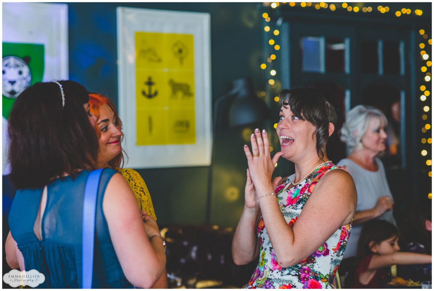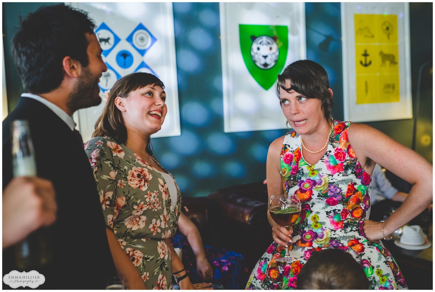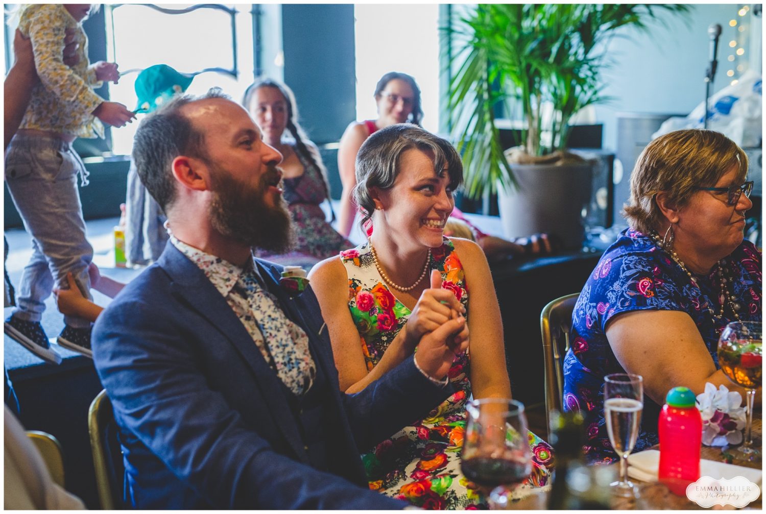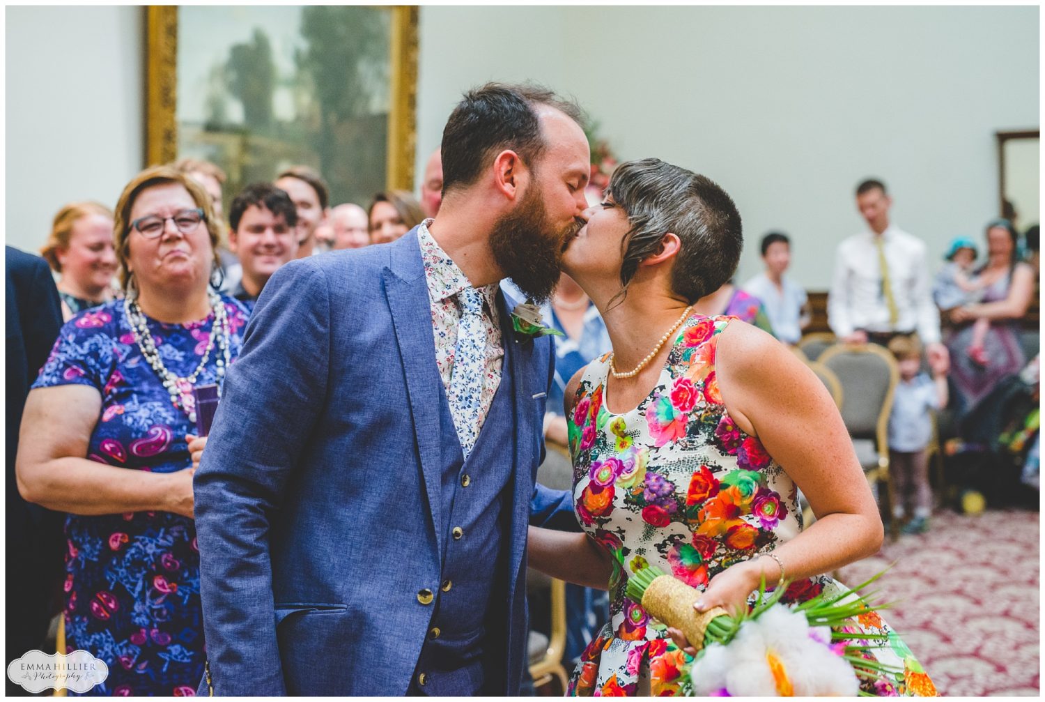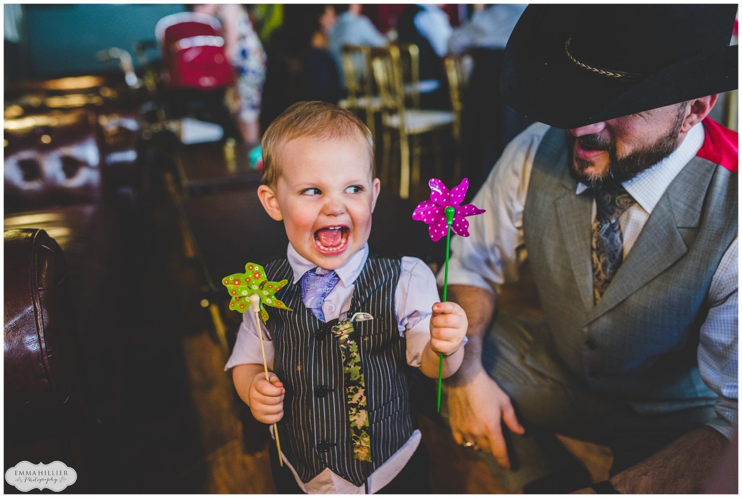 Rachel made her amazingly colourful dress herself (with a matching one for their little daughter!) which she matched with bright pink Dr. Martens and they walked down the “aisle” at St George’s Hall together. They didn’t have bridesmaids or groomsmen but they did let their children Magnus and Marla take part in the speeches which ended in Magnus hogging the mike and causing mass hysterics!